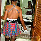 It has been a few weeks since I was at the pool. The same waitress, Green-Tea, spotted me nursing a rock hard hard-on. Ooh, she said, that looks like you need someone to eat your cum. Okay, I said and followed her back again to my room. As she was walking in front of me, her tiny waitress dress bobbing above her stocking tops as usual, I noticed the words 'anal' and 'slut' tattooed on the tops of her legs. I almost lost the use of my own legs when I saw these words. When we got to my door, she immediately bent down and touched her tows, and said, which hole are you going to use today, mister? I am going to severely fuck your anus for the next hour. Oh goody, she said, so long as I can drink some 'gleen tea' first. See, hear, and slip on the lubricated action on video. Oh yeah, after all that green tea, she squatted down and had a piss on the floor. Also on video.