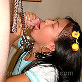 I have often been told about an old man who hangs around outside the supermarket, he has been there for few years. He has got a very cute nineteen year old girlfriend that he rents out for shortime. I have been told she is also a bit into S & M. So I went down there thinking, I have to see this to believe it. Anyway, outside was this aging guy, smoking a rolled up cigarette. I said to him, I need a girl for the night. Yes, he said, and yanked on a dog chain, which was connected to the neck of a very cute girl who was crouching behind the flower boxes. Shit, I thought, this is all a bit weird, even for my experience. I negotiated a price. As I was about to take her back to my apartment, the old man called out, there is one condition, you have to cum in her mouth, and she must not swallow, until she has walked back here to me and I can see it. Okay boss she said. Well that might be weird, and you can see the bloody lot, all on video, where I handcuff and chain her to the bed.